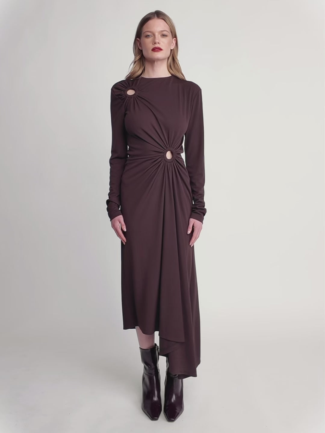 Une robe midi sophistiquée, conçue avec un drapé moderne et des découpes sculpturales. Ce modèle présente des fronces aux épaules et à la taille, créant une silhouette cintrée flatteuse qui met en valeur les lignes naturelles du corps. L'ourlet asymétrique apporte du mouvement et une touche contemporaine, tandis que les manches longues équilibrent l'ensemble. Confectionnée dans un tissu doux et fluide, cette robe se prête aussi bien aux soirées qu'aux tenues de tous les jours élégantes.