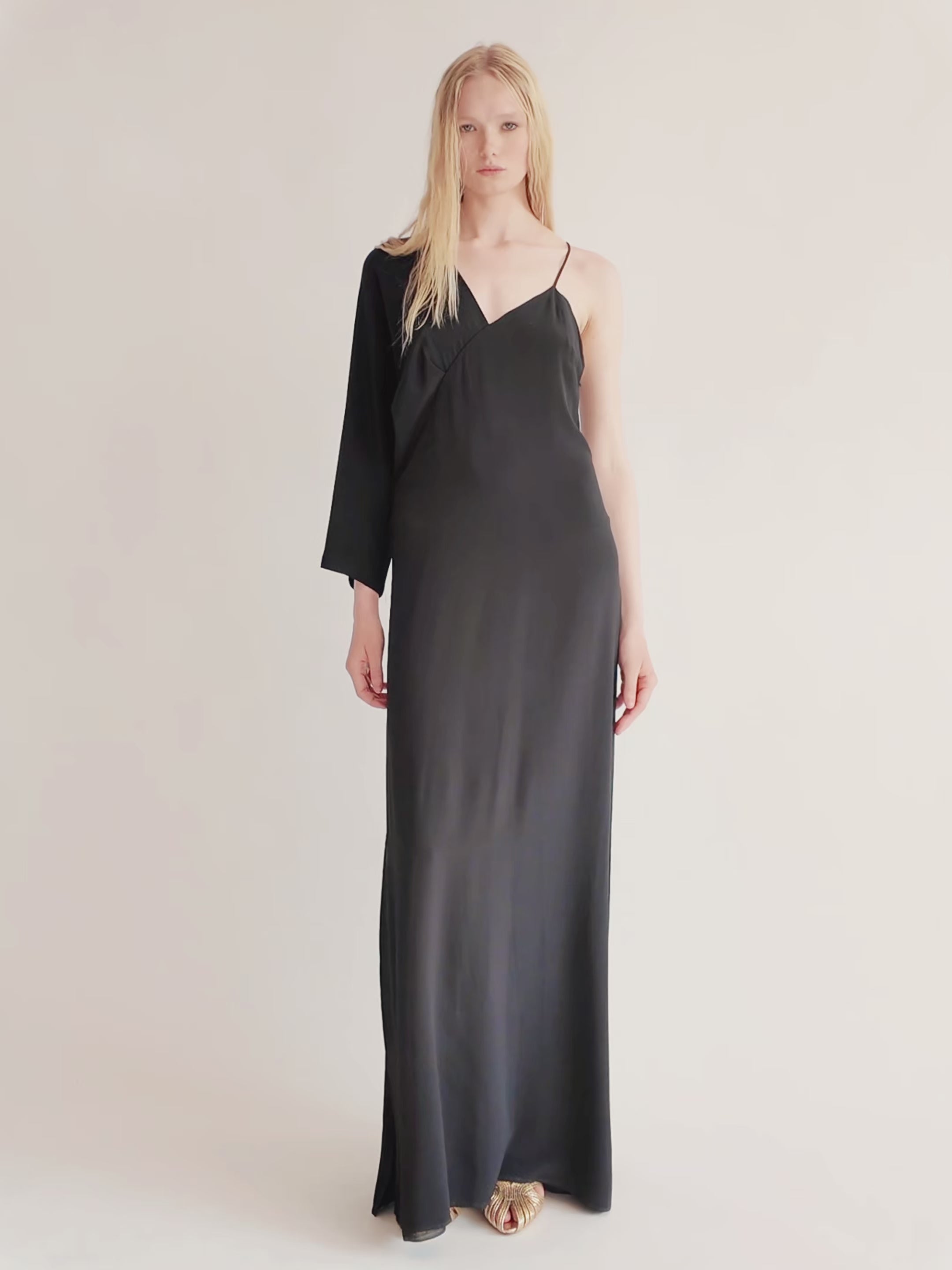 Minimaliste et raffinée, cette robe noire longue présente un élégant décolleté asymétrique, une bretelle délicate et une manche longue. Sa silhouette épouse le corps avec des lignes épurées, tandis que son design mixte apporte une touche théâtrale discrète. Sobre et architecturale, cette pièce est une alternative raffinée à la robe de soirée classique.