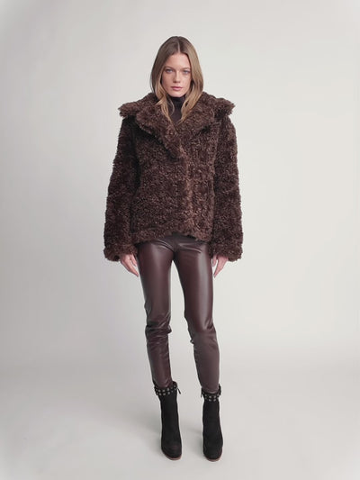 A plush curly faux fur coat designed to bring warmth, volume, and effortless style to your winter wardrobe. Its textured finish adds depth and dimension, while the relaxed silhouette and wide lapel create a polished, modern look. Fully lined for comfort, this cozy statement piece pairs beautifully with both denim and elevated evening outfits.