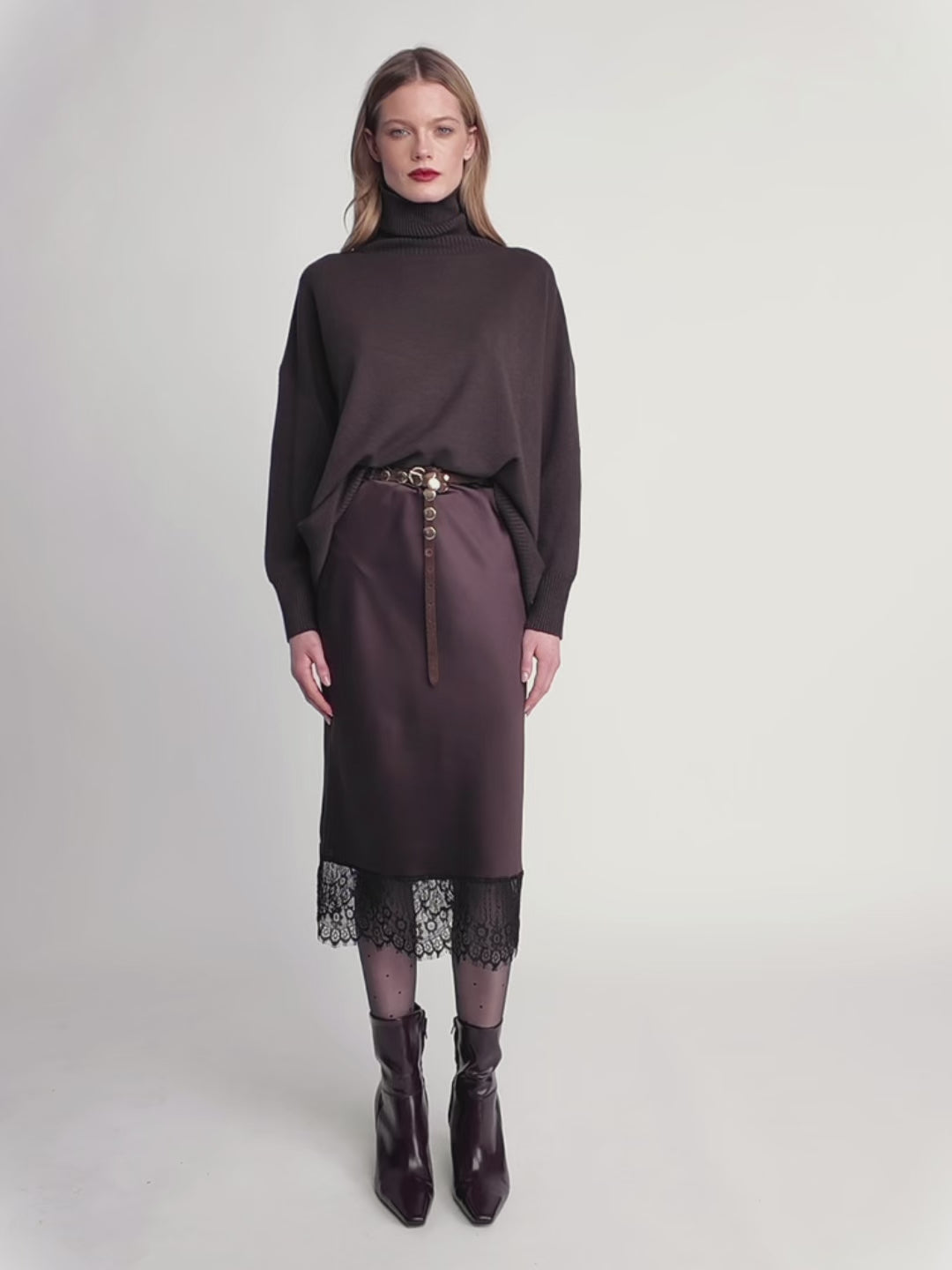 Une jupe midi en satin raffinée, ornée d'une délicate dentelle à l'ourlet, qui apporte une touche de féminité et d'élégance. Le satin lisse et brillant épouse parfaitement les formes, tandis que la dentelle se dévoile subtilement pour un effet romantique et superposé. Conçue pour une taille haute, cette jupe s'accorde sans effort avec des pulls douillets, des tops ajustés ou des blouses de soirée, ce qui en fait une pièce polyvalente idéale pour passer du jour au soir.