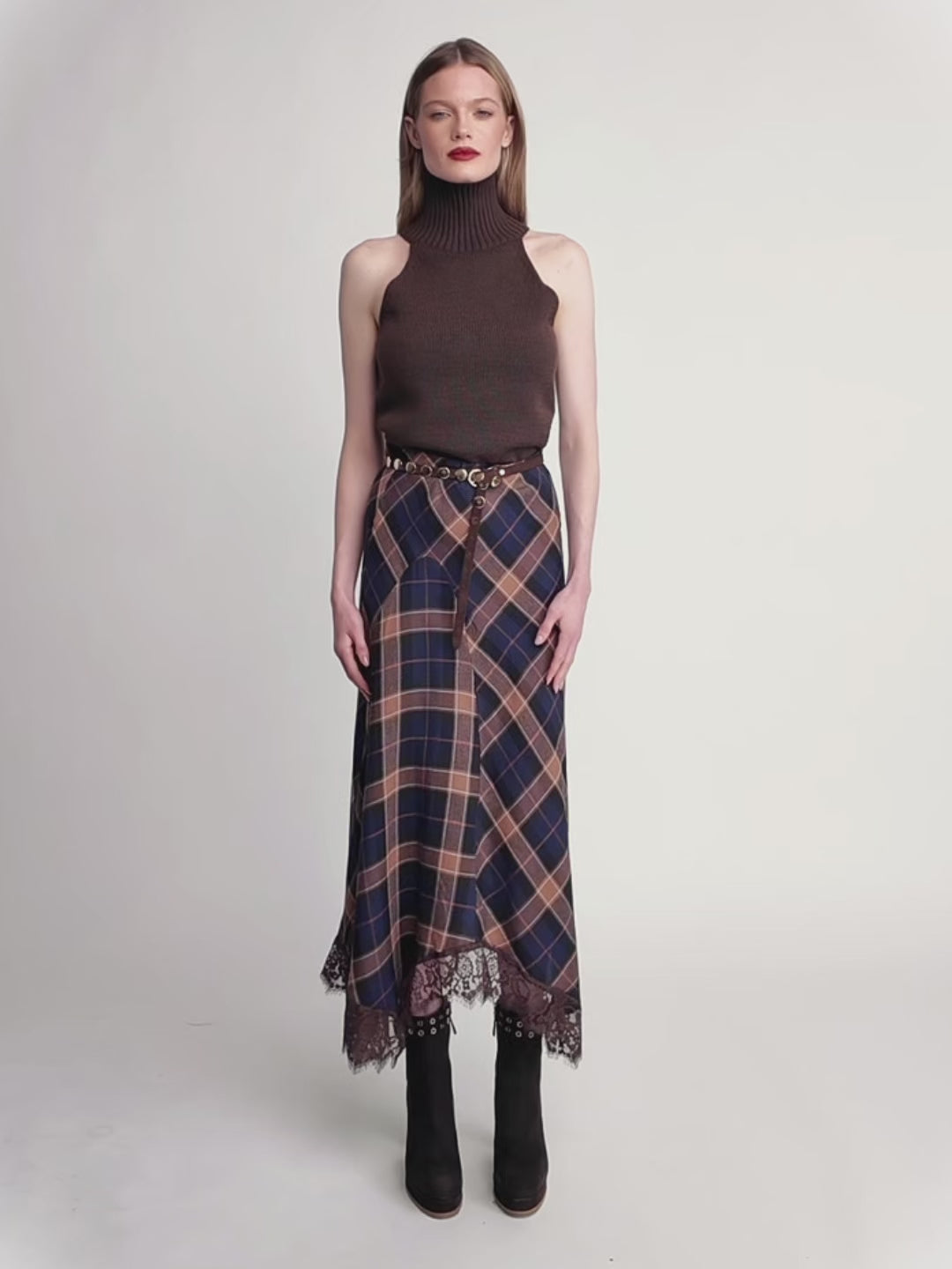 Une jupe midi fluide à carreaux, à la coupe asymétrique et ornée d'une délicate bordure en dentelle pour une touche féminine. Son drapé souple et sa fluidité en font une pièce remarquable, idéale à associer avec des pulls, des bottes ou un haut structuré pour un style quotidien sophistiqué.