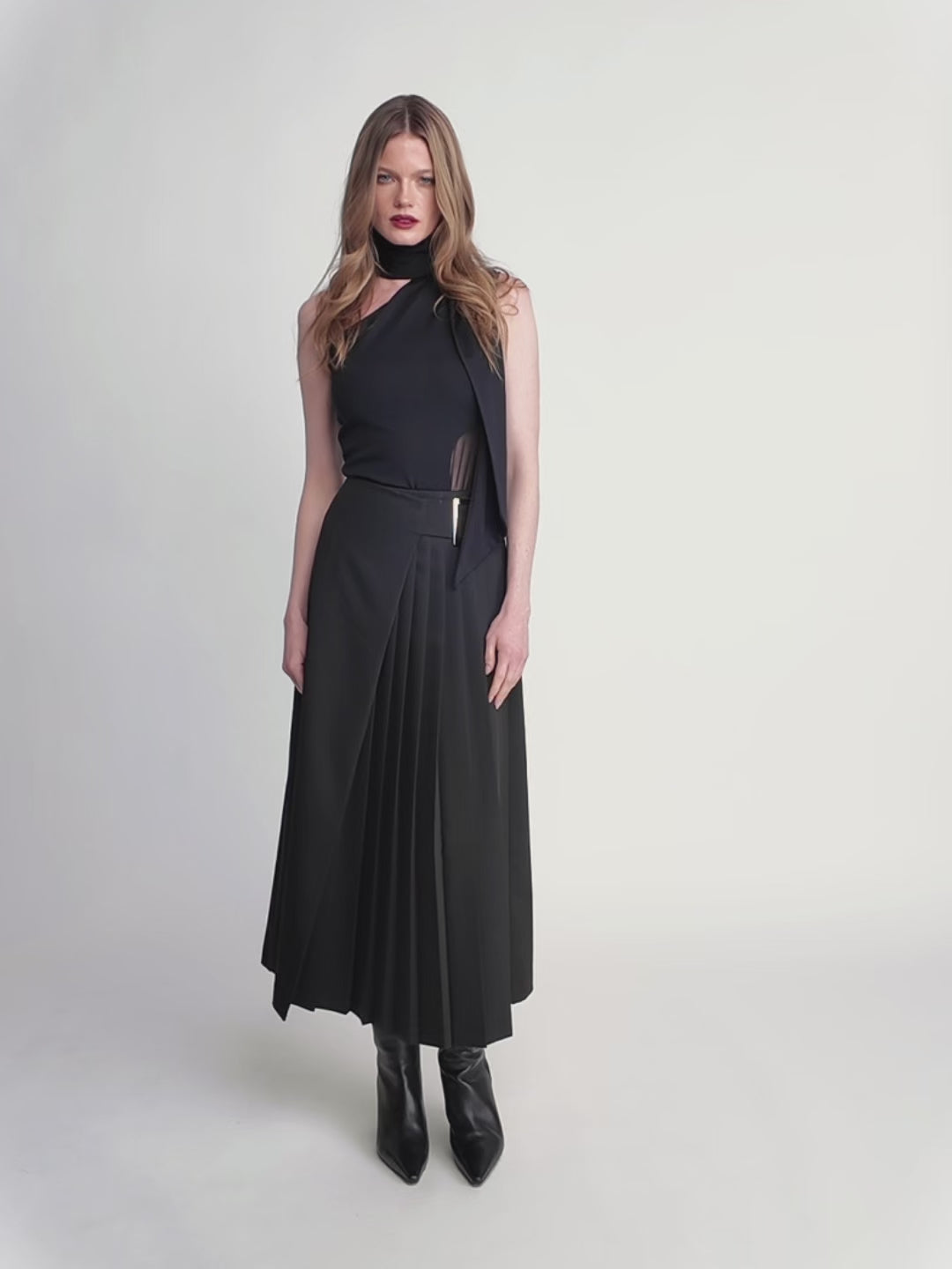 Une jupe midi sophistiquée, à la coupe portefeuille structurée et aux plis raffinés. Le drapé asymétrique crée du volume et du mouvement, tandis que la ceinture ajustable souligne la taille. Confectionnée dans un élégant tissu noir, cette pièce apporte une touche moderne et architecturale à toutes vos tenues. Parfaite avec des tops ajustés, des blouses originales ou des pulls en maille pour un style sophistiqué du matin au soir.