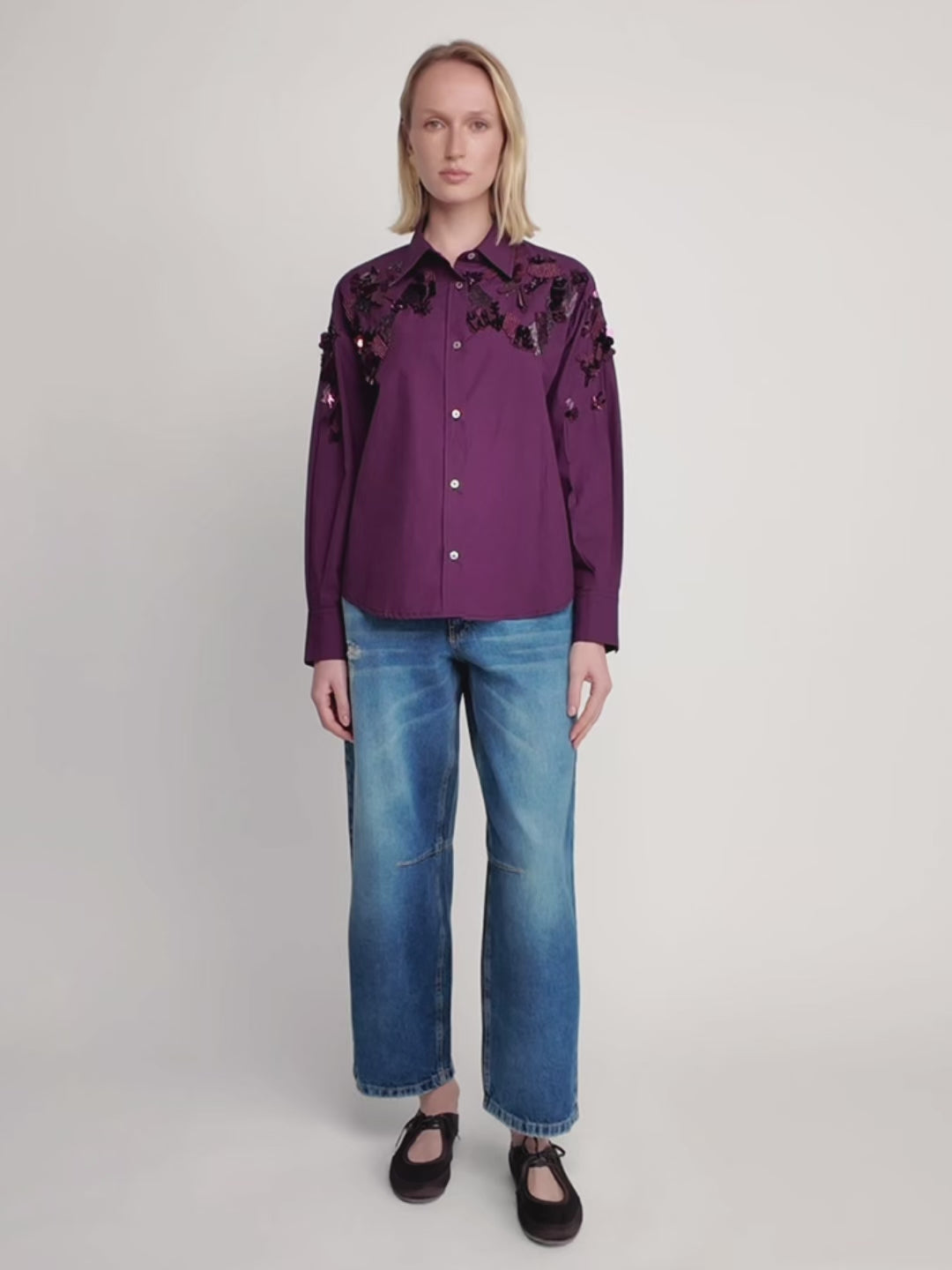 Une chemise classique rehaussée d'une broderie à sequins raffinée sur les épaules et les manches. Confectionnée en coton violet intense, cette pièce allie confort au quotidien et glamour en soirée. Avec son col pointu, sa fermeture boutonnée et ses manches longues, elle est un choix remarquable pour un style polyvalent.