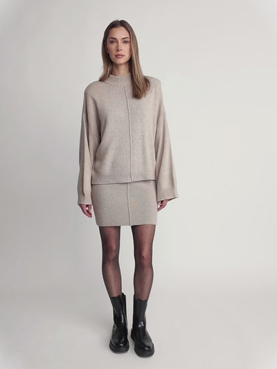 A minimalist essential designed for effortless everyday style. This ribbed knit mini skirt features a clean silhouette with a subtle center seam, offering a modern touch while maintaining timeless appeal. Soft, stretchy, and comfortable, it pairs perfectly with its matching sweater or layers seamlessly with your seasonal favorites. An elevated basic that transitions from weekday to weekend with ease.