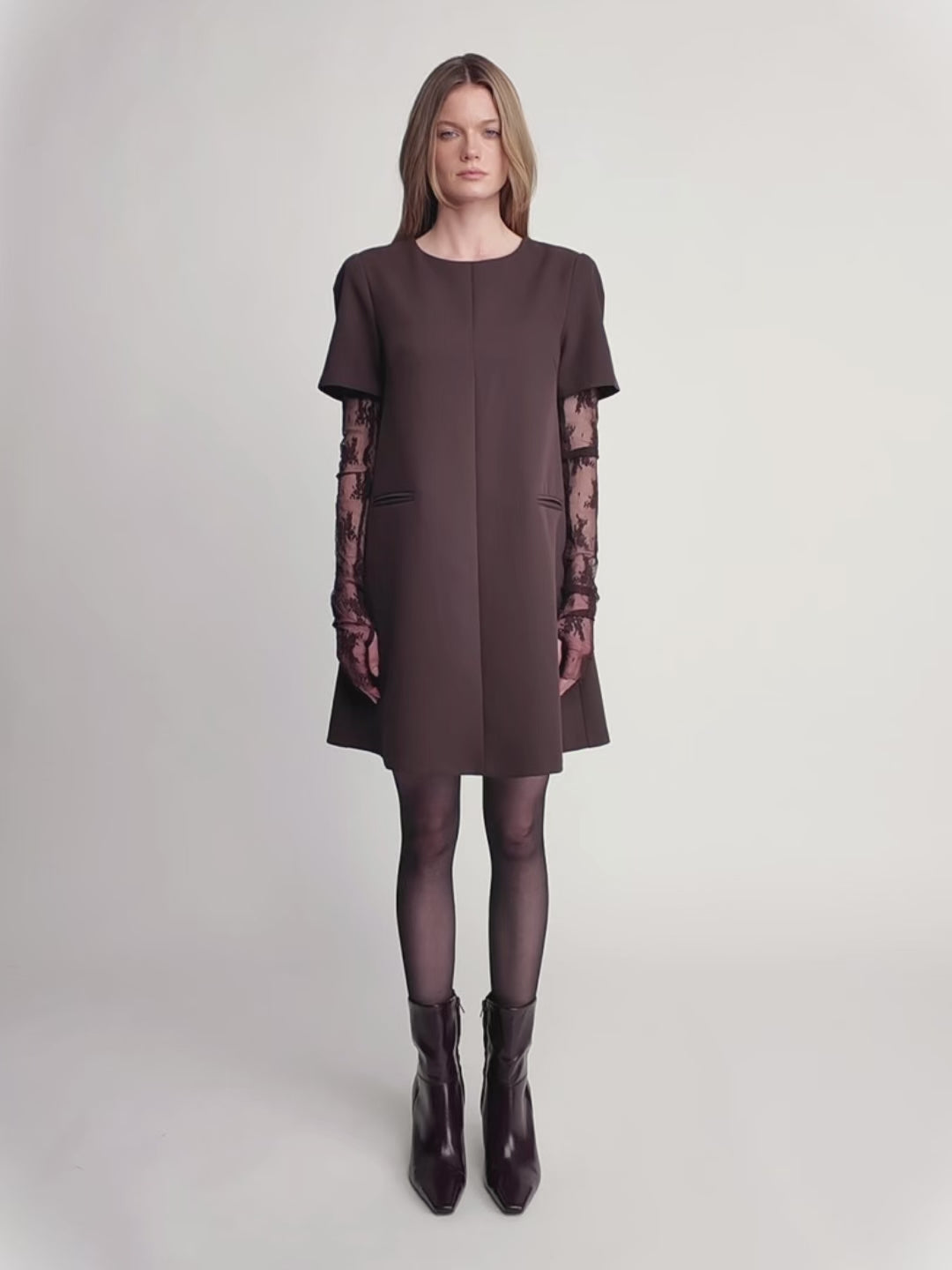 Elegant with a modern edge, this chocolate-brown shift dress features a clean, structured silhouette elevated by sheer lace long sleeves. The minimalist short-sleeve overlay creates a layered effect that balances softness and structure beautifully. Finished with subtle front seaming and discreet side pockets, this piece is perfect for elevated daywear or refined evening styling with boots or heels.