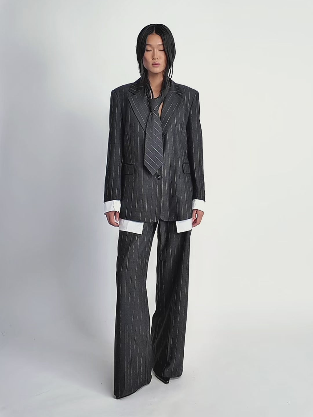 A modern twist on a timeless classic. This pinstripe blazer features a structured oversized silhouette with defined shoulders and a slightly elongated cut. Designed with sharp lapels and flap pockets, it brings effortless sophistication to both workwear and street-style looks. Pair it with the matching tie or tailored trousers for a coordinated finish.
