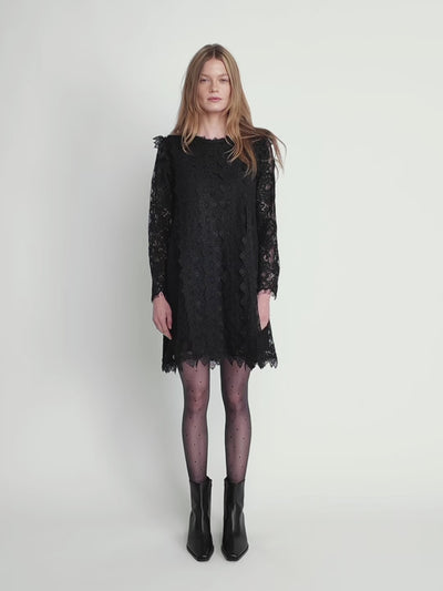 Delicate and timeless, this lace mini dress features intricate floral patterns and scalloped edges for a romantic finish. The high neckline and long sleeves balance sophistication with subtle allure, while the fitted silhouette creates a flattering shape. Perfect for evening gatherings or special occasions.