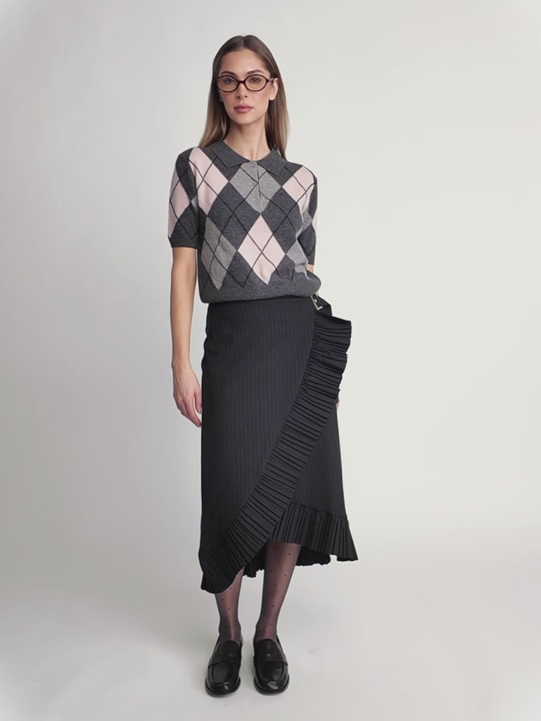 A modern nod to timeless heritage knitwear. Crafted from a warm wool-blend, this polo features a soft argyle motif in understated tones, a refined button placket, and short sleeves for effortless layering. Its cozy yet polished silhouette transitions seamlessly from weekday styling to weekend chic.
