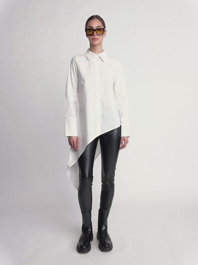 A modern twist on a classic white shirt. Crafted from crisp poplin, this button-down features an eye-catching asymmetric hem that drapes effortlessly for a refined yet contemporary silhouette. With its structured collar and elongated cuffs, it elevates everyday dressing—perfect for pairing with tailored trousers, leather pants, or denim for a sleek, editorial finish.