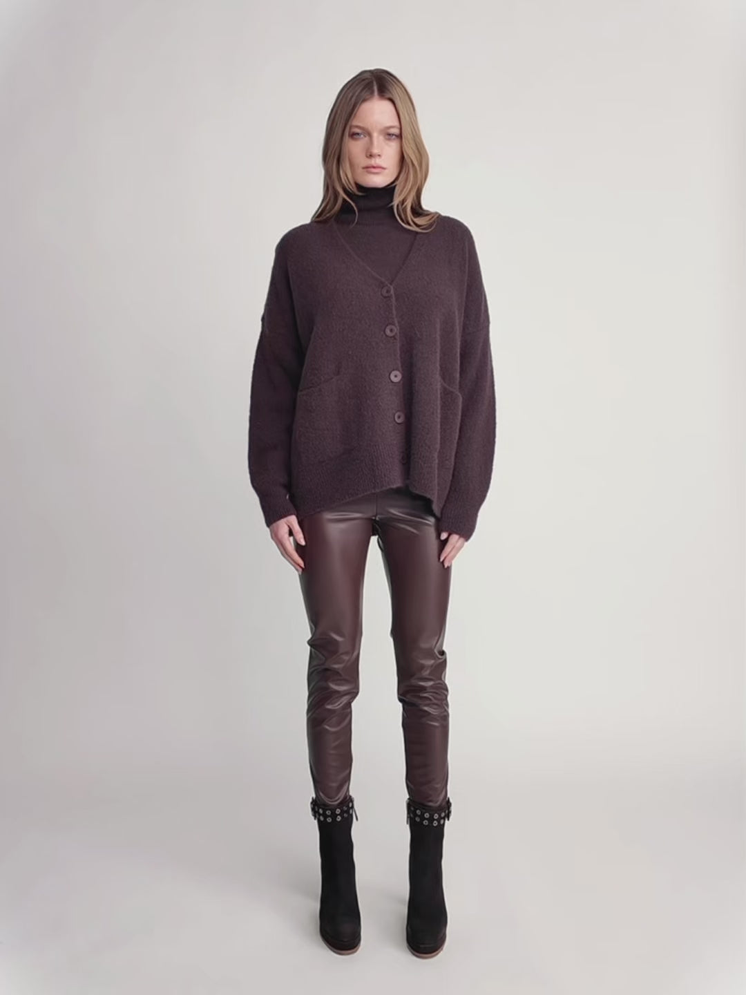 An effortless layering essential designed for comfort and refinement. This relaxed button-front cardigan features a soft, cozy knit with dropped shoulders and an easy drape that flatters every silhouette. Finished with front patch pockets and a clean V-neckline, it adds warmth without compromising style. Perfect over turtlenecks, dresses, or denim for a polished everyday look.
