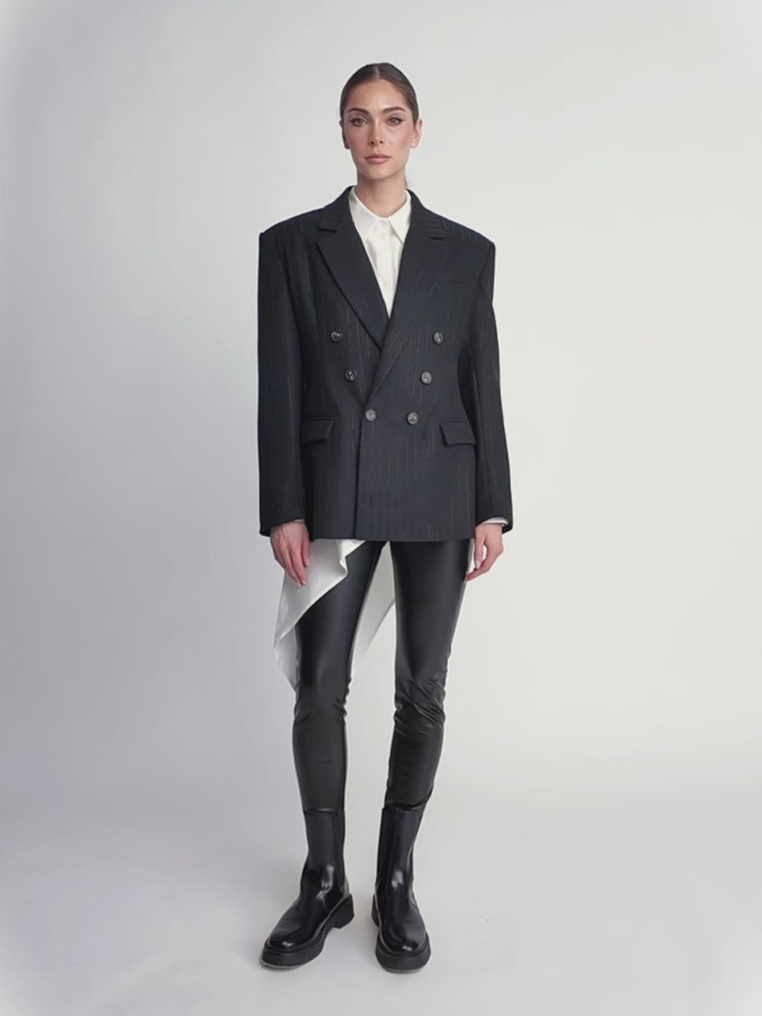 Structured double-breasted blazer with a tailored fit, notched lapel, and front button closure. Finished with subtle sparkle detailing throughout for a refined touch of shine. A timeless statement piece that transitions effortlessly from day to night.