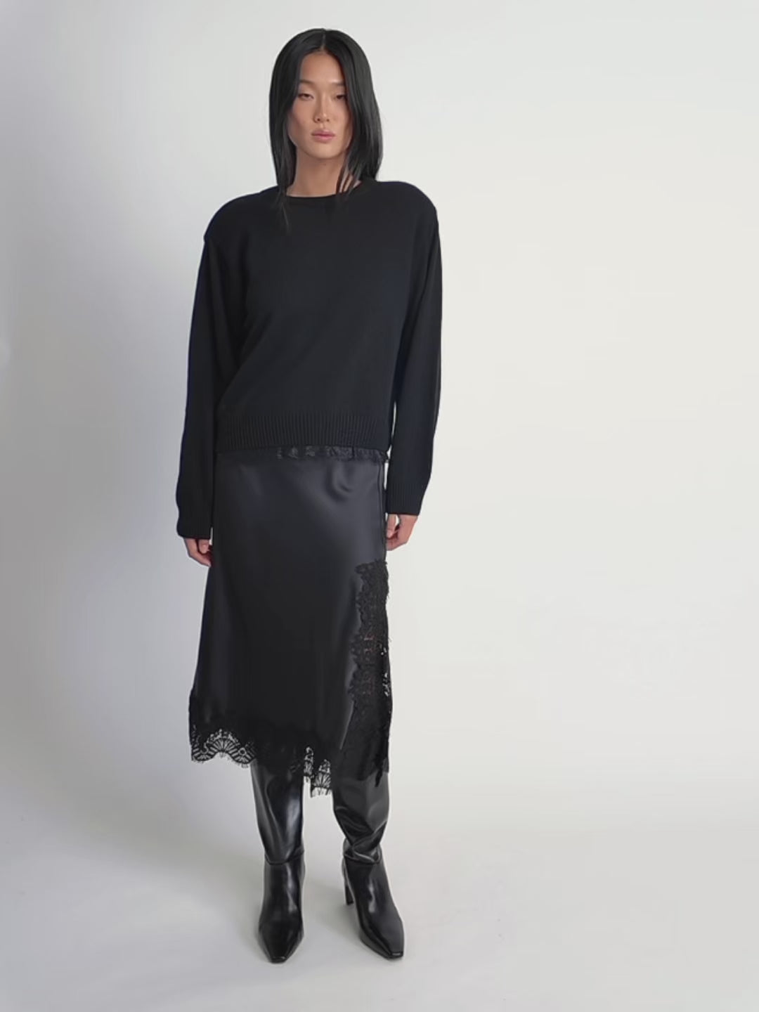 A cozy essential with a feminine edge. This soft knit sweater features a classic crew neckline and ribbed detailing, finished with delicate lace trim along the hem for a subtle contrast of texture. Perfect for pairing with tailored trousers or denim for an effortlessly chic look.