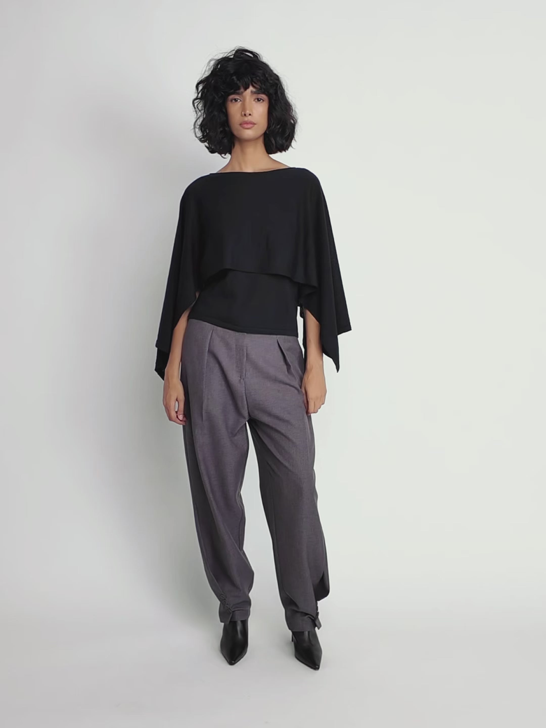 A modern twist on a classic knit. This double-layer top features a structured overlay that creates a subtle cape effect, adding dimension and sophistication to its minimalist silhouette. Crafted in a soft ribbed knit, it blends comfort with elevated design — perfect styled with tailored pieces or matching knit separates.