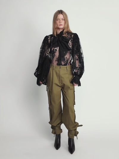 A modern twist on utility style, these khaki green cargo pants are designed with a relaxed fit and multiple flap pockets. Crystal embellishments add a touch of glamour to the rugged silhouette, while adjustable hem straps allow for a customized fit. Perfect for styling with both casual basics and elevated pieces for an edgy yet chic look.