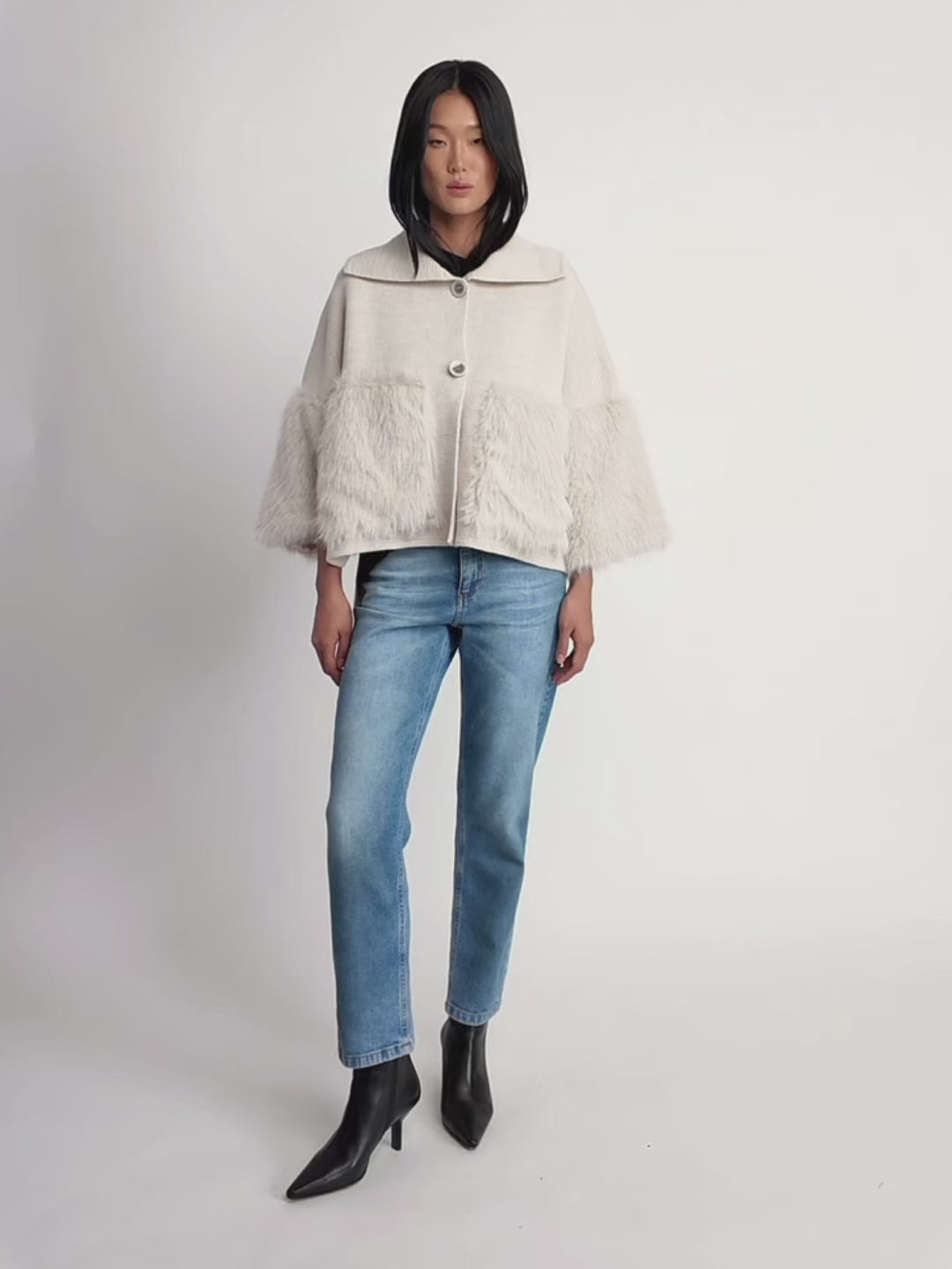 A refined knit jacket with elevated texture and structure. This style features a soft, structured knit body contrasted with plush faux fur panels for added warmth and sophistication. Designed with a relaxed silhouette and front button closure — perfect for layering over everyday looks or evening ensembles.