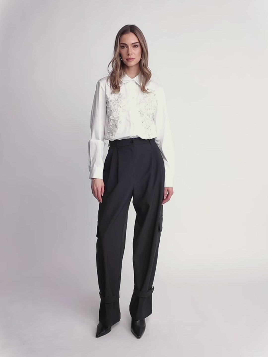 A classic white shirt elevated with delicate embroidery and intricate embellishment. Designed with a relaxed silhouette and structured collar, this piece blends timeless tailoring with feminine detailing. The floral embroidery adds texture and sophistication, making it perfect for dressing up tailored trousers, denim, or skirts. A polished wardrobe essential with a modern, romantic twist.