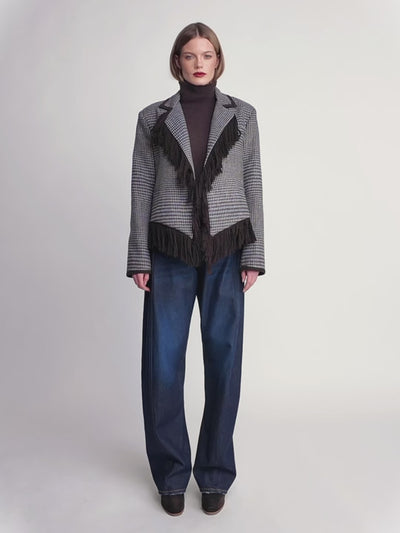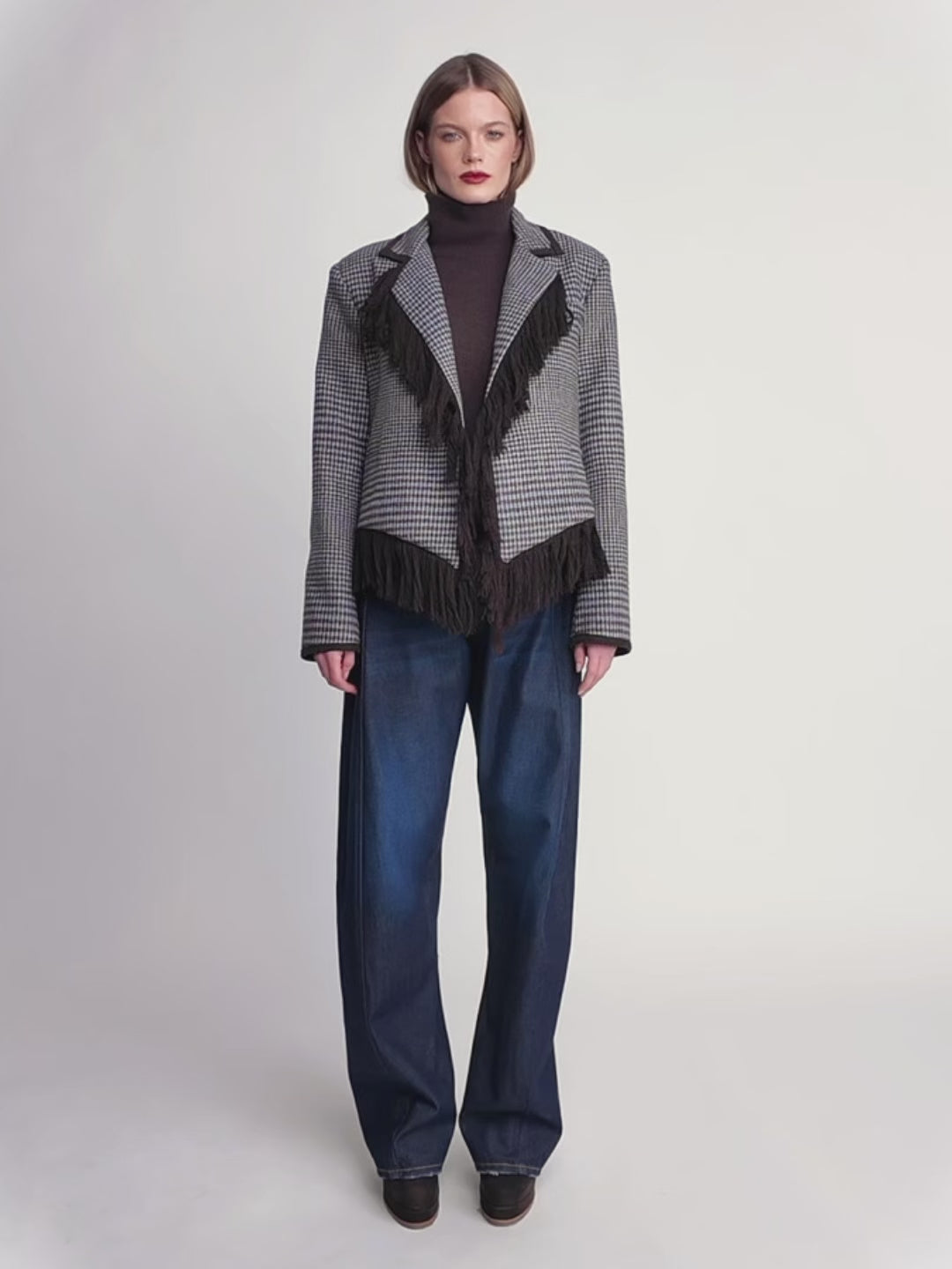 Tailored blazer featuring a notched lapel and front closure, finished with statement fringe detailing along the front and hem. Designed with a structured silhouette for an elevated yet modern look. Perfect for adding texture and movement to both casual and dressy outfits.