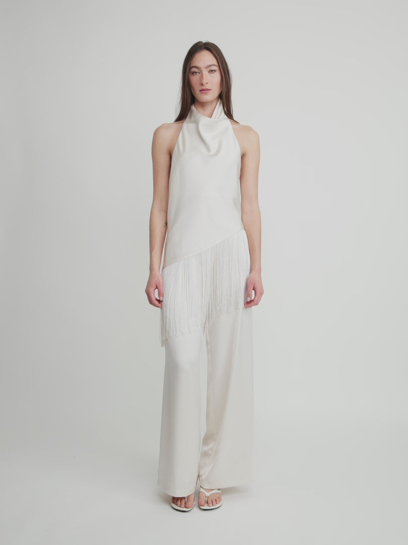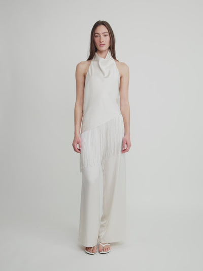 Elegant top with a gracefully draped cowl front and sleeveless silhouette that elongates the frame. The asymmetrical hem features delicate fringe detailing, adding subtle movement and contemporary edge. Refined fluid fabric creates a sophisticated drape perfect for elevated daywear or evening occasions. Clean lines and textural contrast deliver understated luxury.