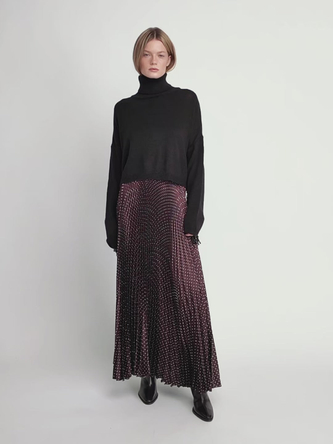 A modern knit with a playful edge. This turtleneck sweater features soft ribbed detailing and statement fringe along the sleeves and hem, adding movement and texture to a timeless silhouette. Effortlessly stylish, it pairs beautifully with denim or tailored pants for a chic, bohemian-inspired look.