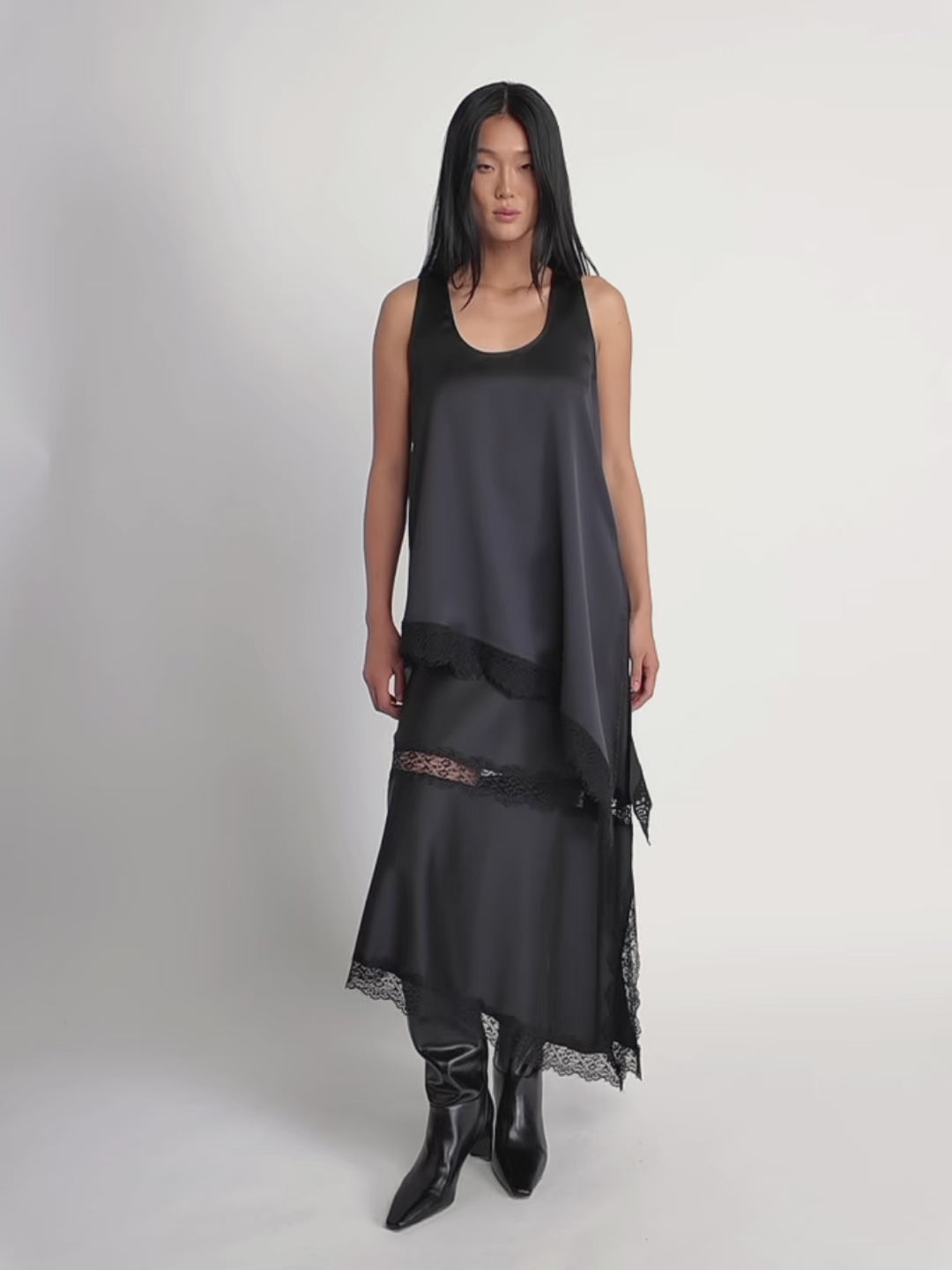 Lace-Trim Satin Midi SkirtS / BLACK