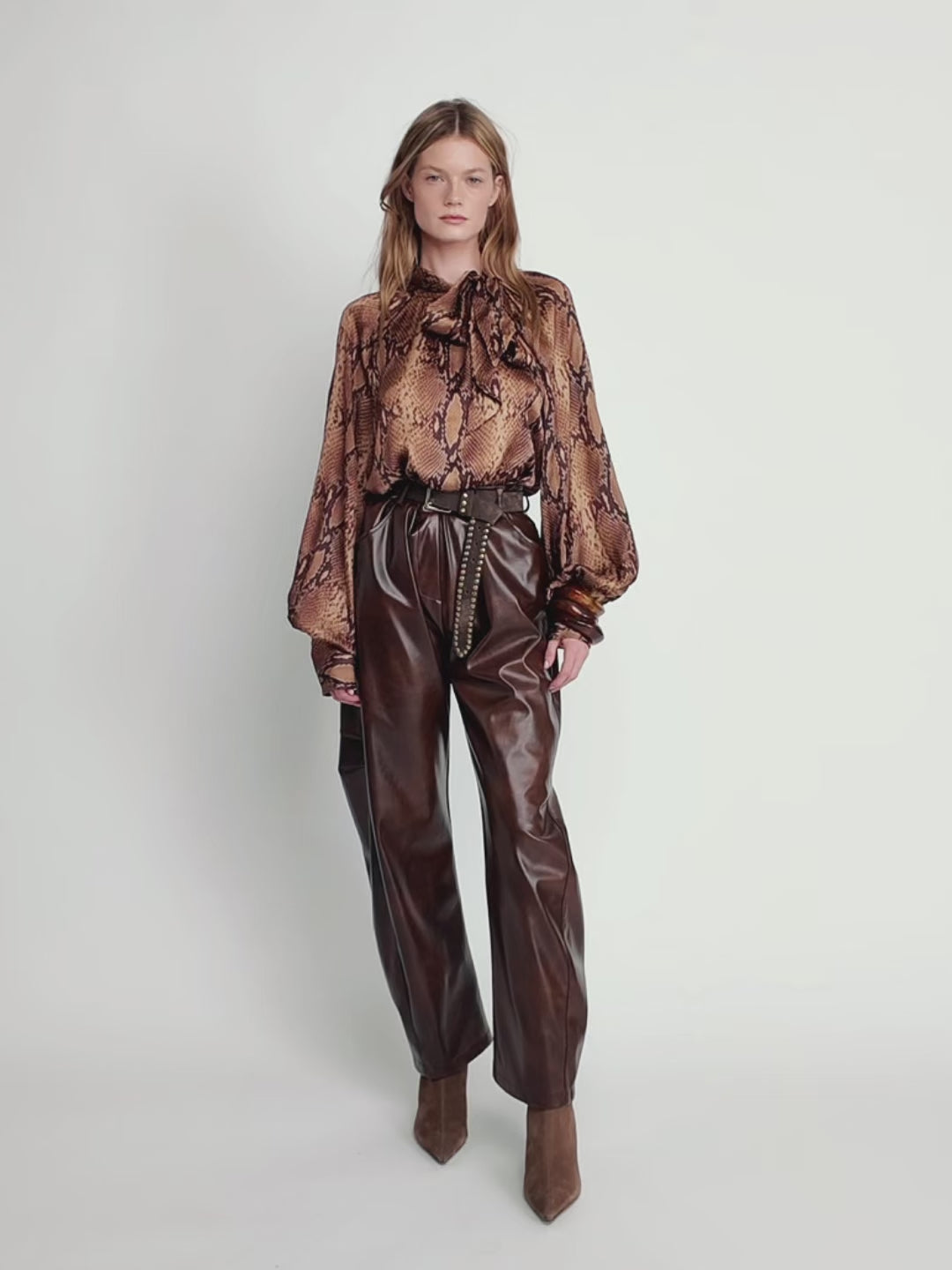 Crafted in a rich brown faux leather, these pants redefine everyday sophistication. Featuring a structured high-waist fit, tailored seams, and a straight-leg silhouette that elongates the figure. The soft, supple texture mimics real leather while offering comfort and flexibility — a timeless piece to elevate both casual and refined looks.