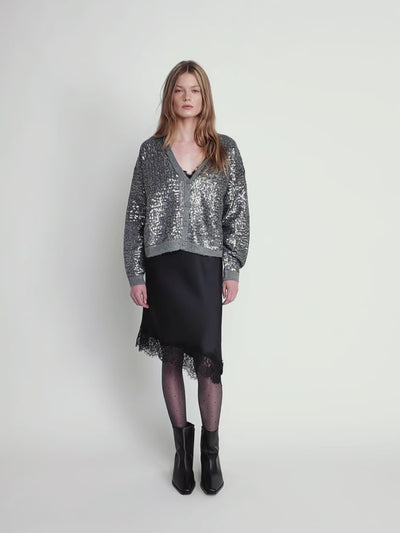 A statement knit that catches the light from every angle. This cropped cardigan blends cozy texture with all-over sequins for a refined yet festive look. Designed with a V neckline and front buttons, it transitions effortlessly from day to night — pair it with denim for casual sparkle or tailored pieces for an elevated finish.