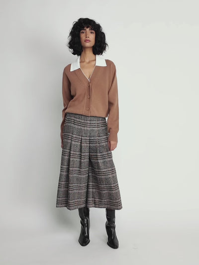 A refined take on everyday knitwear. This camel-toned cardigan features a crisp white contrast collar that adds a touch of sophistication to its relaxed silhouette. Finished with front button fastening and ribbed trims, it’s the perfect piece to layer over tailored pants or skirts for an effortlessly polished look.