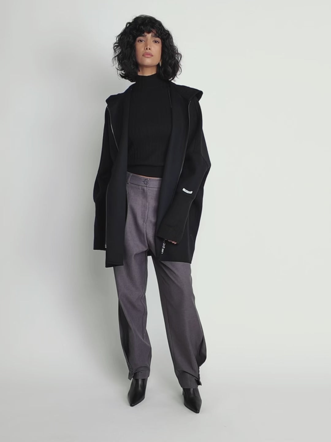 Soft, warm, and effortlessly refined — this longline wool-blend hoodie combines comfort with elevated minimalism. Designed with a relaxed fit, front zip closure, and wide ribbed cuffs, it’s the perfect layering piece for transitional seasons. Style it over tailored separates or casual knits for an understated, modern look.