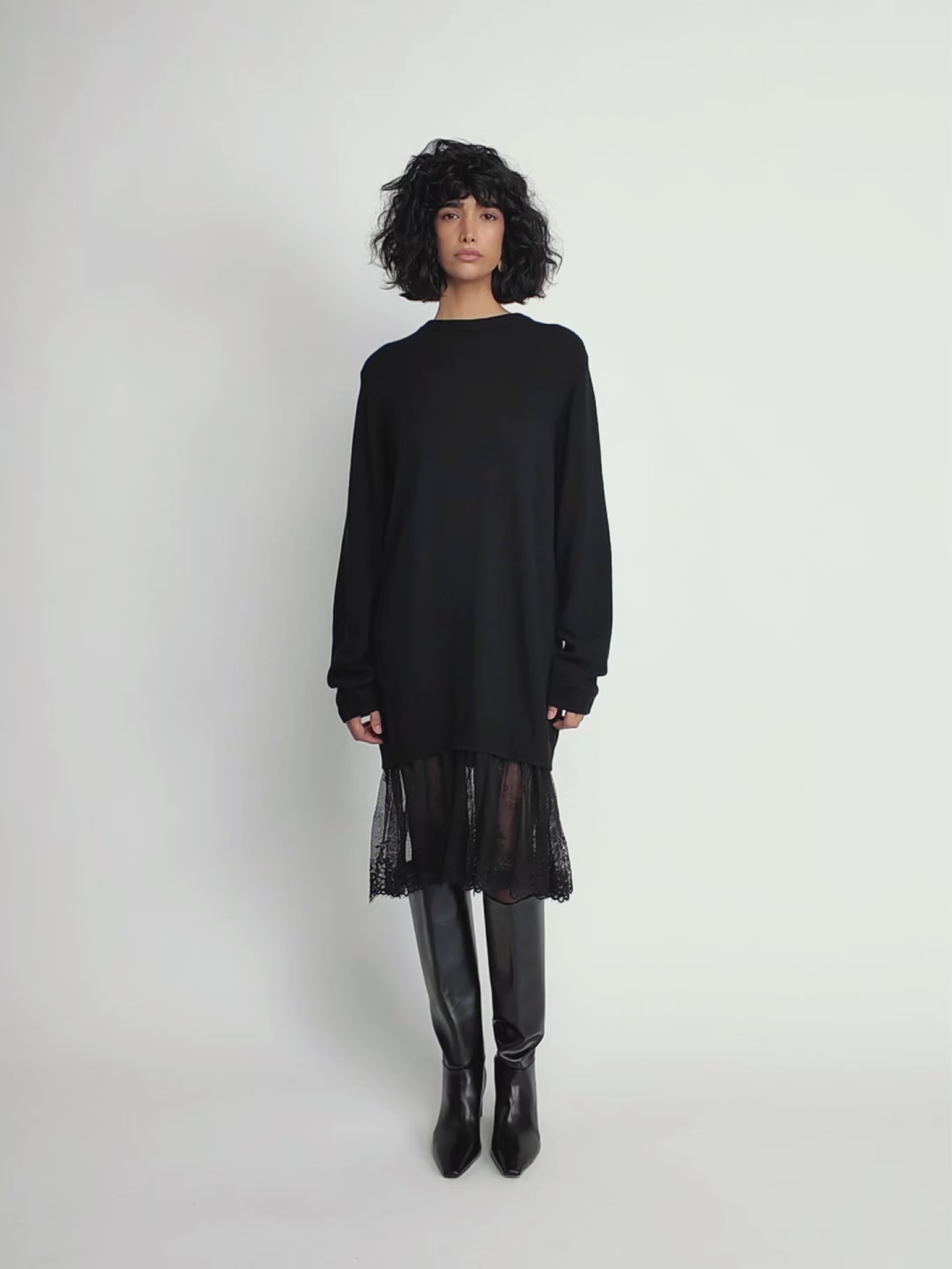 Effortlessly elegant, this knit dress blends cozy texture with delicate lace detailing. Designed in a soft stretch knit with a round neckline and long sleeves, it features a refined lace hem that adds a subtle romantic touch. Perfect for day-to-night wear — pair it with boots or heels for a chic, timeless look.