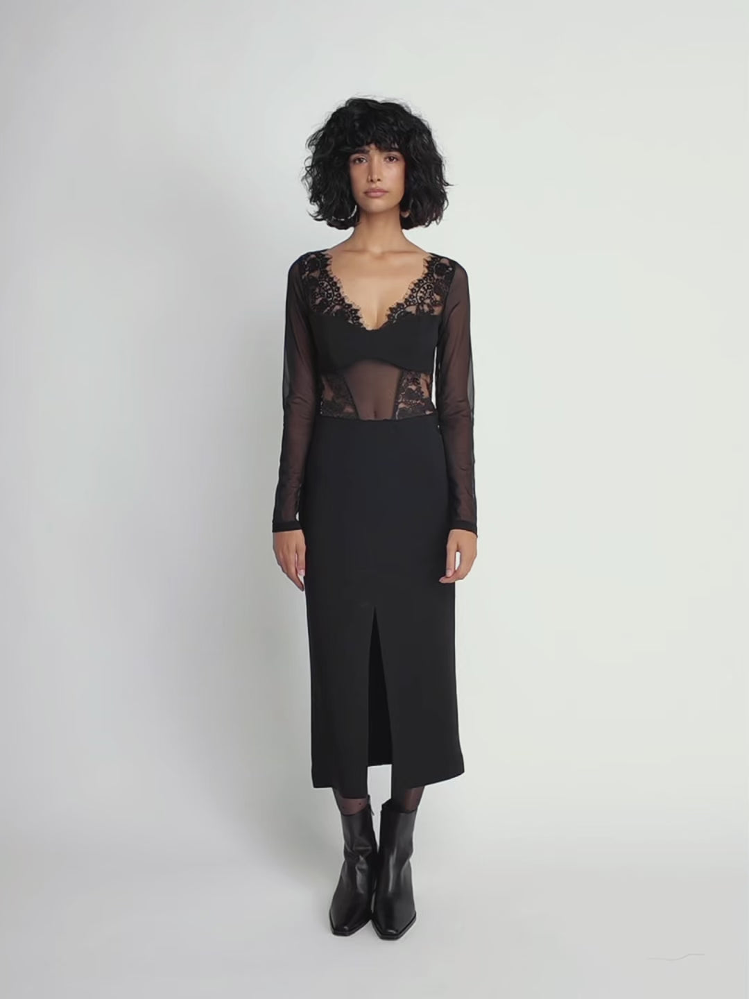 Elegantly alluring, this black midi dress features a sheer lace bodice with intricate detailing and long sleeves for a refined, feminine look. The fitted silhouette and front slit add a modern touch, balancing sophistication with subtle sensuality — perfect for evening events or formal occasions.