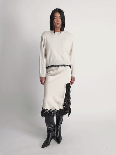 A cozy essential with a feminine edge. This soft knit sweater features a classic crew neckline and ribbed detailing, finished with delicate lace trim along the hem for a subtle contrast of texture. Perfect for pairing with tailored trousers or denim for an effortlessly chic look.