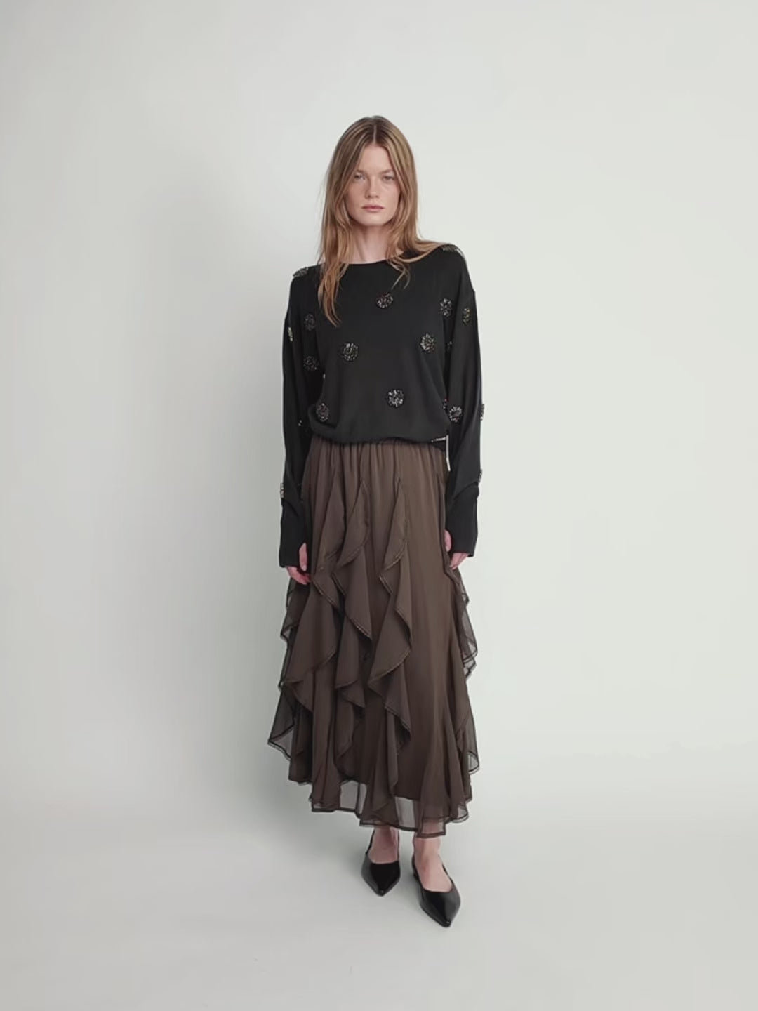 Delicate embroidery meets everyday elegance. This black knit sweater features tonal floral embroidery throughout, adding texture and a touch of femininity to its clean silhouette. Designed in a soft, medium-weight knit, it’s perfect for pairing with tailored pieces or denim for a refined yet relaxed look.