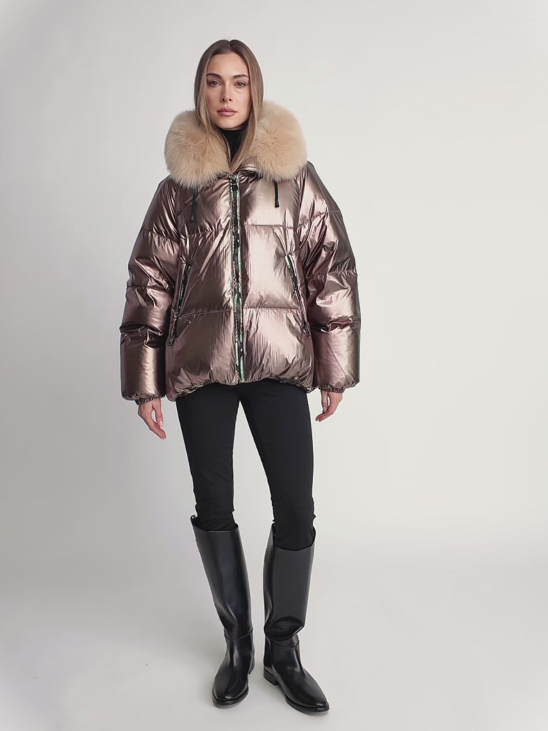 A statement winter puffer designed for both warmth and style. This metallic coat features an oversized silhouette, high-shine finish, and a luxurious real fur collar that adds a touch of elegance. The padded construction provides exceptional insulation, while the zip closure and side pockets keep it practical for everyday wear. A standout piece that elevates any cold-weather look.
