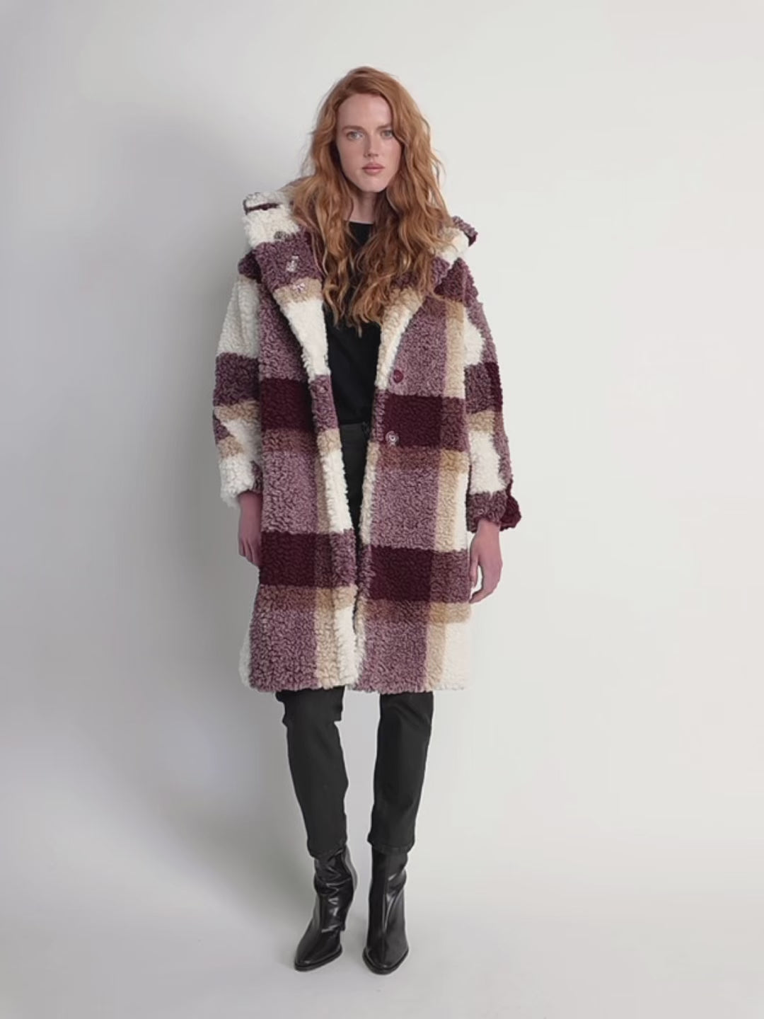 Wrap yourself in warmth and style with this oversized teddy coat, featuring a bold checked pattern in soft neutral and burgundy tones. Its plush faux-shearling texture and wide lapel collar create a cozy yet elevated silhouette, perfect for layering over knits or denim. A standout piece that blends comfort, texture, and modern appeal.