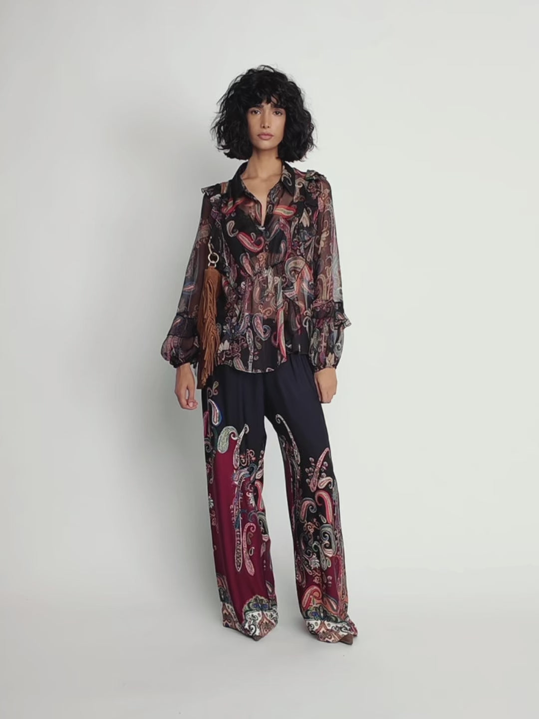 A statement piece that blends comfort with elegance. These wide-leg pants feature a flowing silhouette adorned with a rich paisley print in jewel tones — blending burgundy, emerald, and amber hues against a deep black base. Designed with an elastic waistband for effortless wear, they move beautifully with every step and add a touch of bohemian sophistication to any outfit.