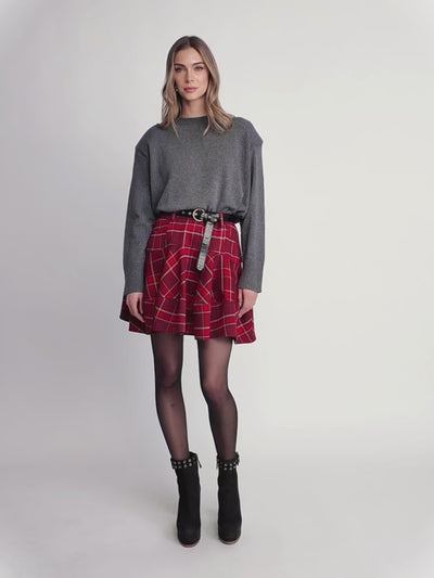 A playful plaid mini skirt designed in a classic red tartan for a festive, timeless feel. The A-line silhouette creates movement and flatters the waist, while the soft pleating adds volume and shape. Perfect for pairing with cozy knits, tights, and boots, this skirt brings a chic, modern touch to cold-weather dressing—ideal for everyday wear or holiday styling.