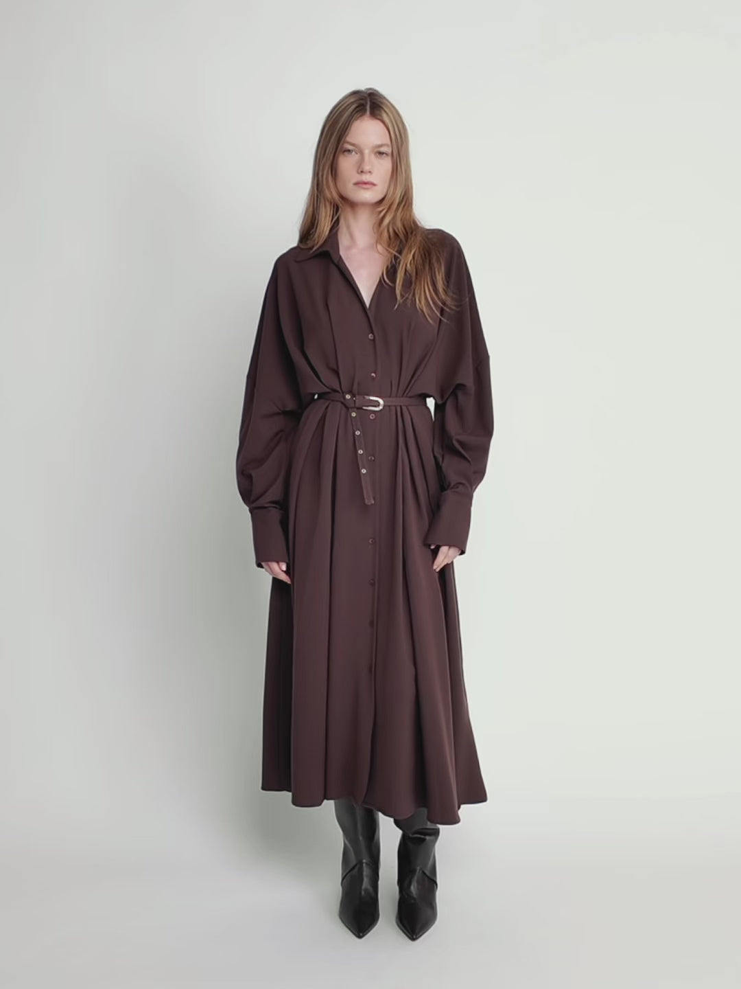 Sophisticated and fluid, this chocolate brown maxi shirt dress features soft pleats that elongate the silhouette and create graceful movement. Designed with a collared neckline, button-down front, and matching belt to define the waist, it’s a timeless piece that transitions effortlessly from day to evening.