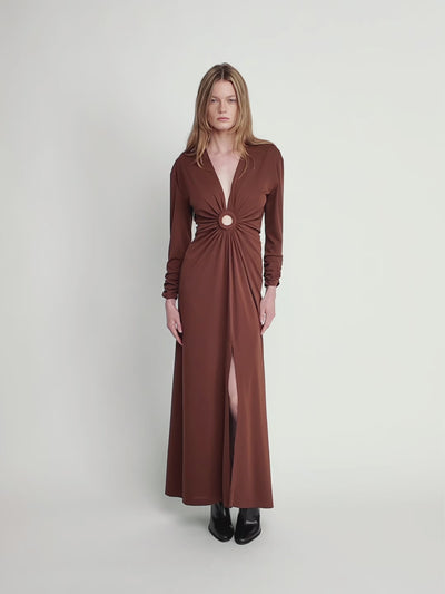 A daring yet elegant maxi dress featuring a plunging V-neckline and a central ring detail that gathers the fabric for a flattering drape. The long sleeves balance the bold cut-out, while the front slit adds movement and allure. Perfect for evening occasions where sophistication meets modern edge.
