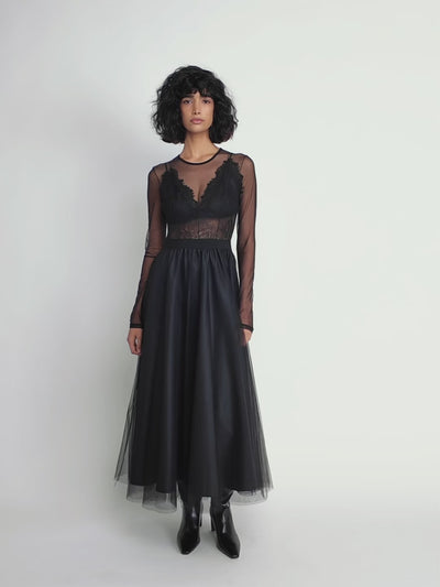 A captivating blend of romance and allure, this black dress features a sheer mesh bodice adorned with intricate lace detailing and long sleeves for a sophisticated edge. The flowy tulle skirt adds movement and grace, making it the perfect statement piece for evening events or special occasions.