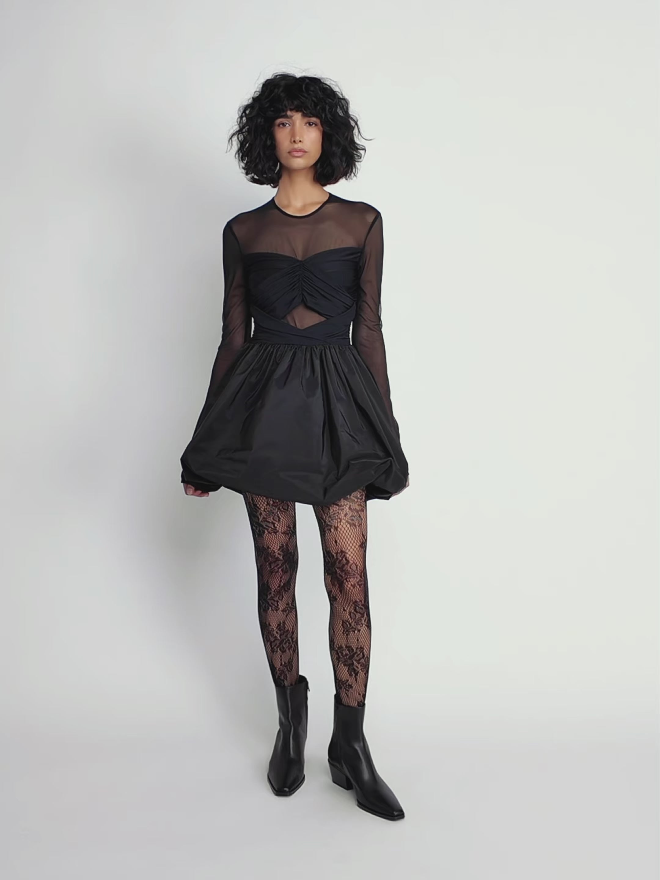 Bold yet refined, this black mini dress features a sheer mesh neckline and sleeves contrasted by a structured, ruched bodice. The gathered detailing creates a sculpted silhouette, while the voluminous skirt adds a touch of drama. Perfect for evening occasions when you want to make an unforgettable impression.