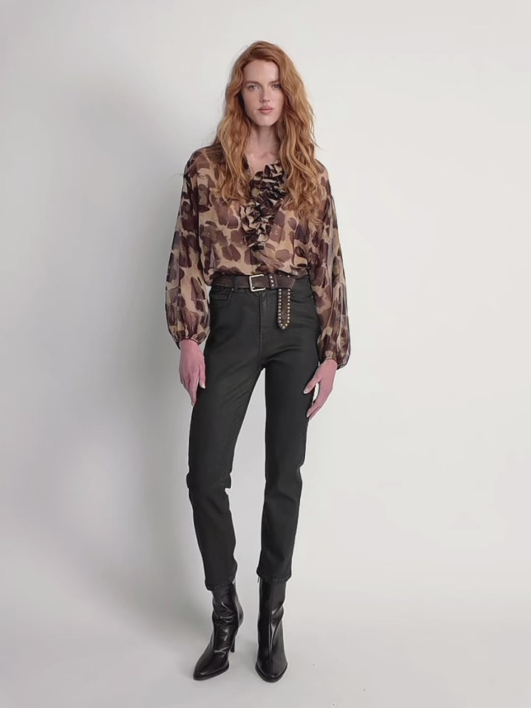 A feminine take on a classic silhouette. This sheer blouse features a delicate abstract print in earthy tones, accentuated by a ruffle detail along the button placket. Lightweight and effortlessly elegant — perfect for tucking into tailored trousers or layering under a blazer for an elevated day-to-night look.