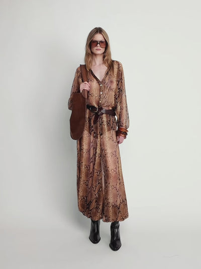 A lightweight sheer blouse featuring an all-over snakeskin print and front button closure. Its airy silhouette and fluid drape make it the perfect layering piece for both casual and elevated looks.