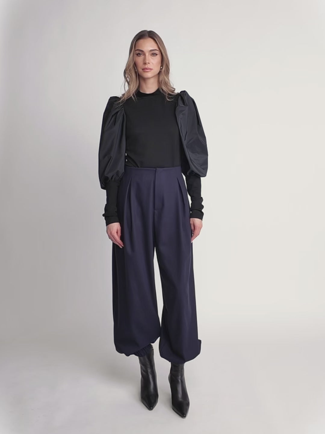 High-waisted tailored joggers designed with soft pleating, side pockets, and a relaxed tapered leg finished with subtle ankle gathering. Blending structure with comfort, these pants offer a refined yet effortless silhouette—perfect for elevated everyday wear, office styling, or modern casual looks.