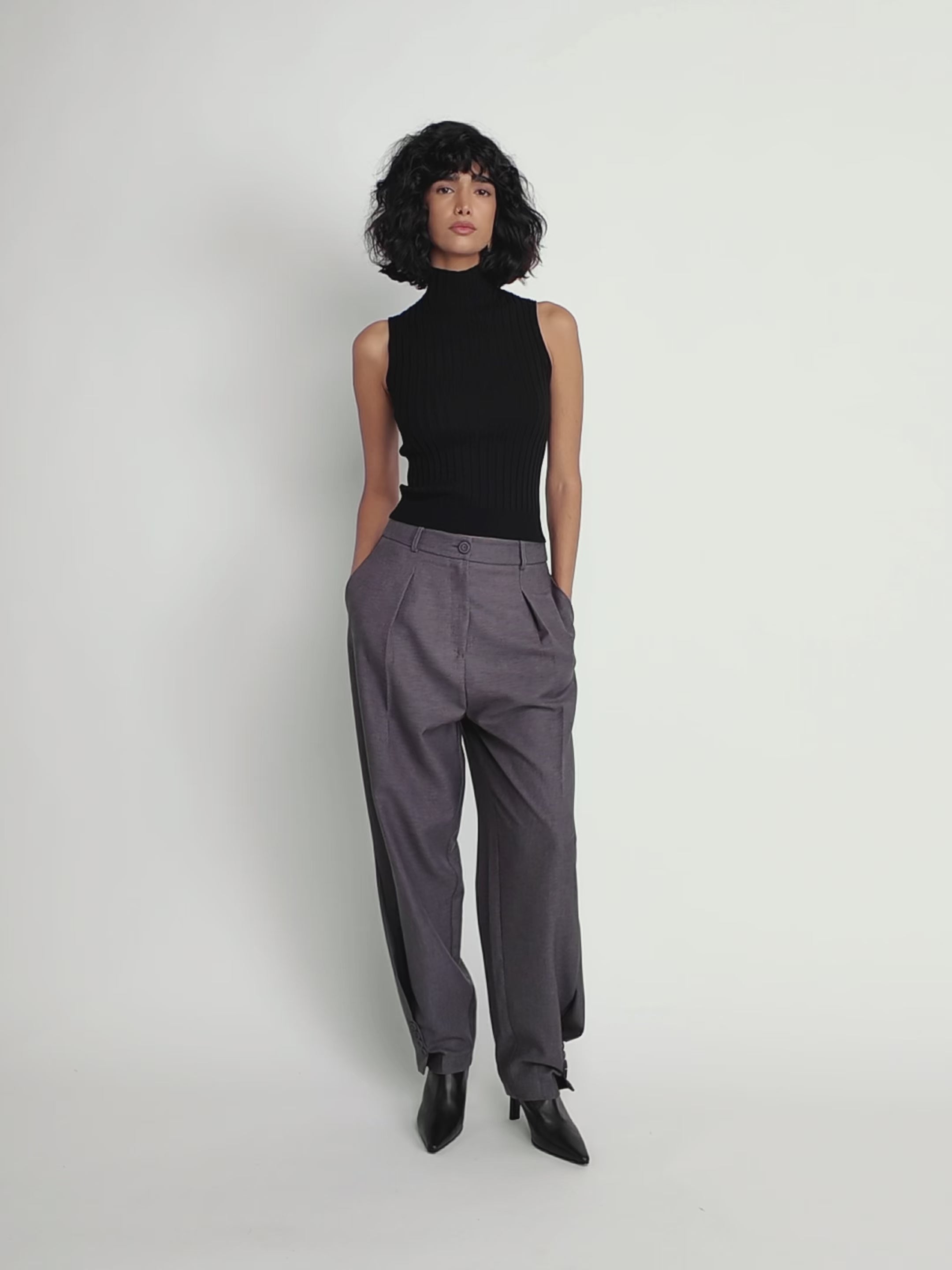 Chic, structured, and timeless — these grey tailored pants are a wardrobe essential. Designed with a mid-to-high waist and sharp front pleats, they elongate the silhouette while maintaining a polished fit. The tapered leg and ankle-length cut add a modern touch, making them perfect for both office wear and elevated everyday looks.