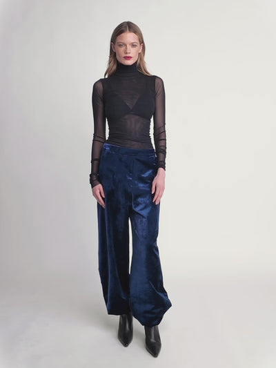 These velvet balloon pants feature a high-rise waist with a softly voluminous leg that tapers at the ankle for a sculpted, contemporary silhouette. Crafted in plush velvet for a rich, fluid drape, they offer both comfort and statement appeal. Designed with side pockets and a relaxed fit, they elevate any look from day to evening with effortless sophistication.