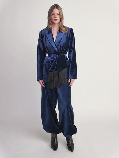 A tailored velvet jacket designed with a structured silhouette and a flattering self-tie belt at the waist. Featuring classic lapels, front pockets, and subtle fringe detailing for a soft statement finish. This piece effortlessly blends elegance with modern edge—perfect for evening looks or elevated layering.