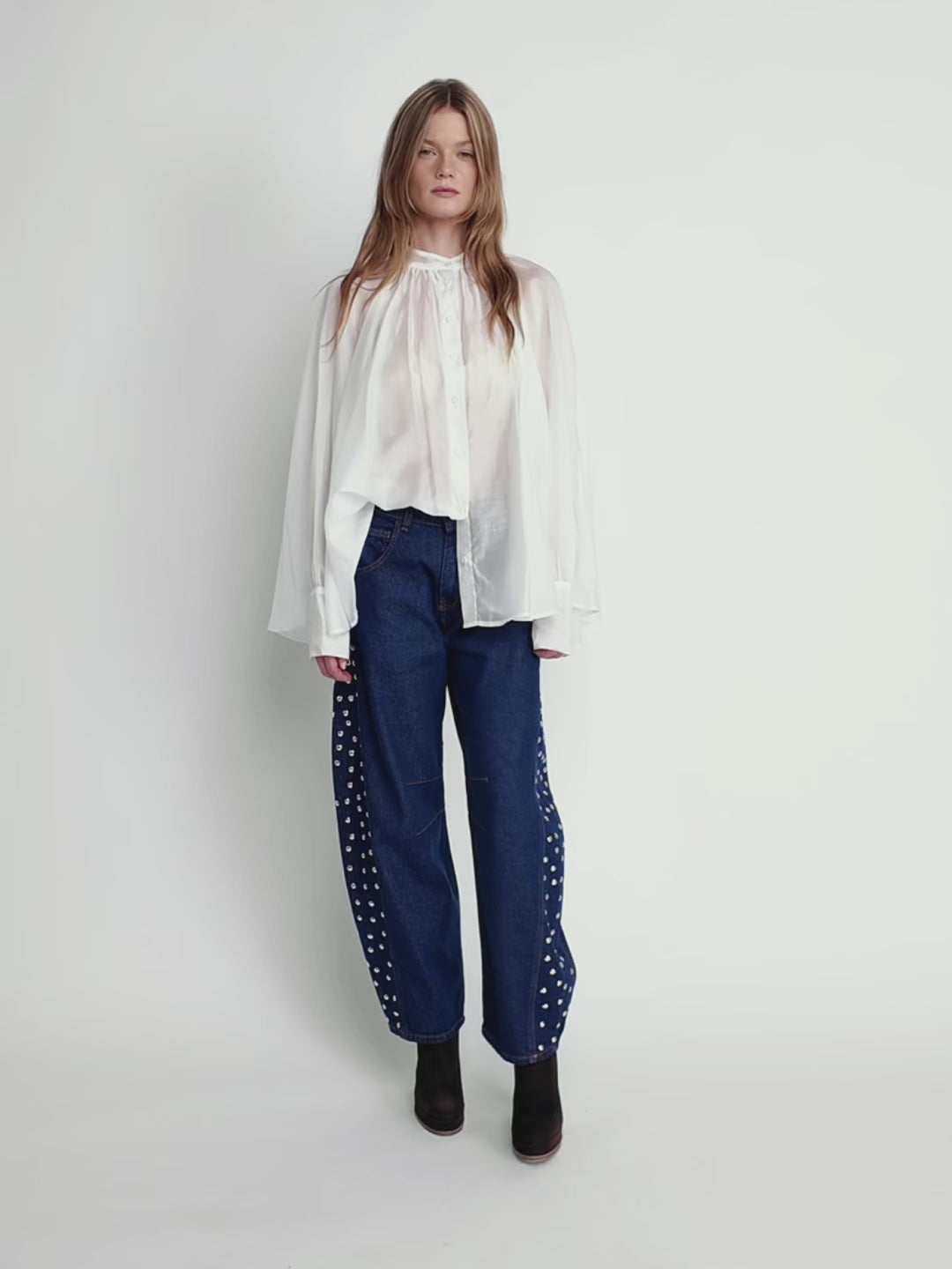 Delicately sheer and effortlessly fluid, this blouse is crafted from soft Tencel for a lightweight, breathable feel. Featuring a gathered neckline and button-down front, it brings an understated sophistication to any look. Perfect for layering under blazers or pairing with high-waisted trousers for a refined yet modern finish.