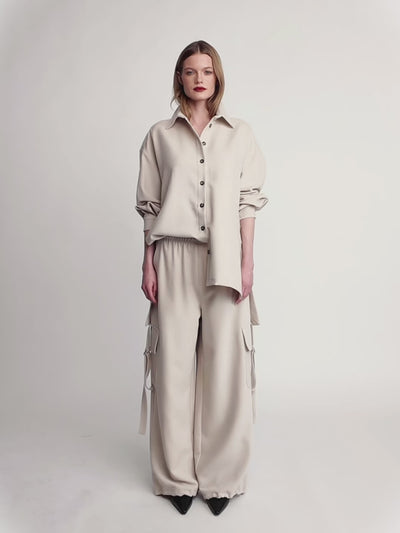 Effortlessly chic with a utilitarian edge, these wide-leg cargo pants redefine relaxed tailoring. Designed with a fluid drape and adjustable cargo details, they offer both comfort and contemporary style. The elastic waistband ensures an easy, flattering fit, while the minimalist silhouette keeps the look elevated and versatile. Pair them with matching tops or crisp shirting for a polished, modern set.