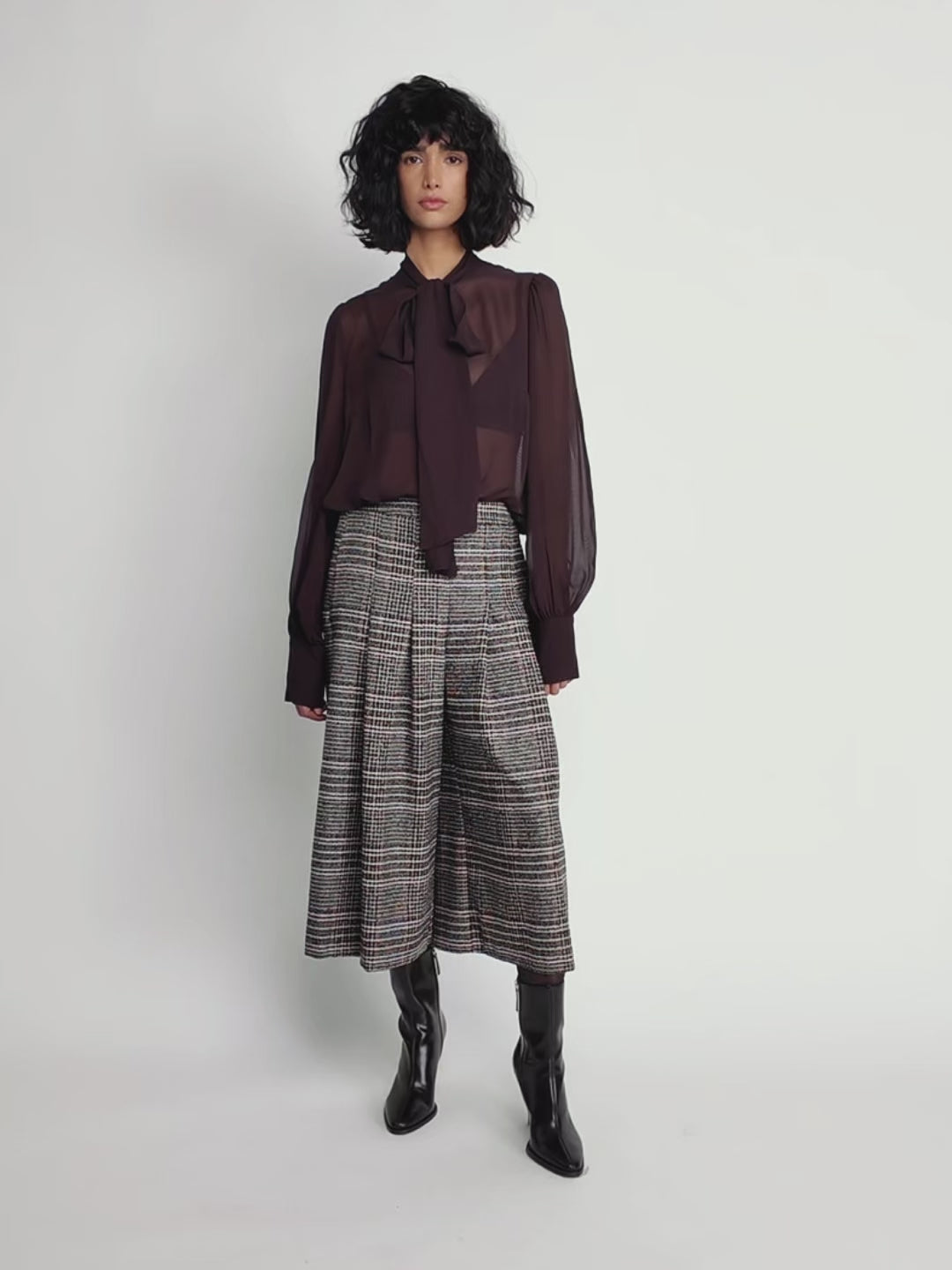 A timeless plaid reimagined with modern proportions. These high-waisted wide-leg trousers feature soft pleating and a fluid drape that moves effortlessly with you. The rich brown and ivory glen plaid pattern adds a sophisticated touch to your everyday rotation — perfect with a turtleneck and blazer for an elevated fall look.